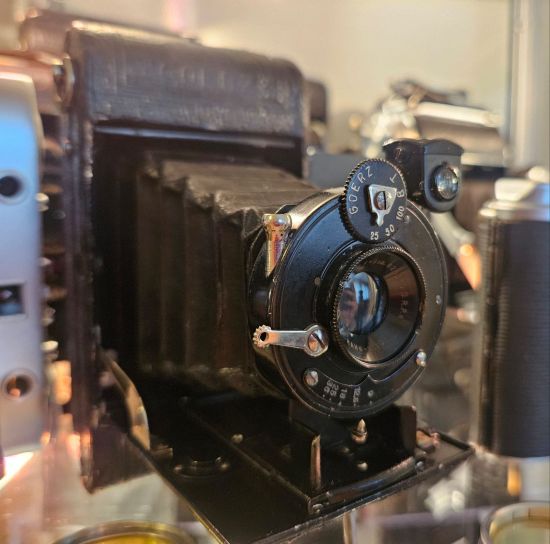 Macchina fotografica a soffietto Goerz d’epoca (anni ’20), con obiettivo Prontar 1:9 f=8cm.