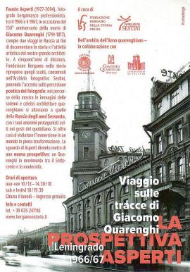 Fausto Asperti nel 1966 e il 1967, in occasione del 150° anniversario della morte di Giacomo Quarenghi (1744 -1817), fece due viaggi in Russia per documentare l’attività artistica del nostro grande architetto. A cinquant’anni di distanza, Fondazione Bergamo nella Storia ripropone quegli scatti, conservati nell’Archivio fotografico Sestini. ponendo l’accento sulla percezione poetica del fotografo: nella mostra le immagini delle solenni e celebri architetture quarenghiane si alternano a quelle della Russia degli anni Sessanta, con i suoi anonimi protagonisti colti nei gesti del quotidiano. Lo sguardo di Asperti offre la prospettiva di un Quarenghi in movimento tra il Settecento e la modernità.