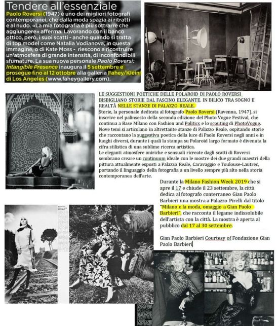 Si susseguono ininterrottamente (in effetti nella storia della fotografia mai vi fu pausa) le mostre di grandi fotografi che, facendo della fotografia la loro ragione di vita e utilizzando strumenti analogici, hanno saputo creare delle opere d’arte immortalando atmosfere e a volte creando linee di pensiero che hanno influenzato lo sviluppo della società moderna. Artisti internazionali in Italia (come Werner Bishop, F.C. Gundlach, ecc.) o artisti italiani all’estero (come Paolo Roversi, Gianpaolo Barbieri, ecc.) che espongono saltuariamente alcune delle loro opere create nell’arco dei tanti anni delle loro lunghe carriere per deliziare gli appassionati e additare strade ai neofiti.