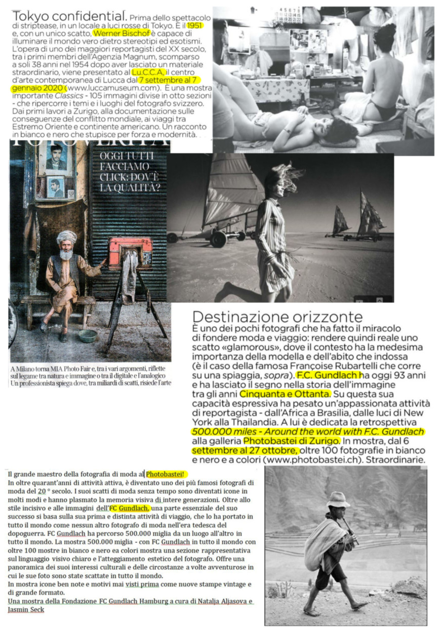 Si susseguono ininterrottamente (in effetti nella storia della fotografia mai vi fu pausa) le mostre di grandi fotografi che, facendo della fotografia la loro ragione di vita e utilizzando strumenti analogici, hanno saputo creare delle opere d’arte immortalando atmosfere e a volte creando linee di pensiero che hanno influenzato lo sviluppo della società moderna. Artisti internazionali in Italia (come Werner Bishop, F.C. Gundlach, ecc.) o artisti italiani all’estero (come Paolo Roversi, Gianpaolo Barbieri, ecc.) che espongono saltuariamente alcune delle loro opere create nell’arco dei tanti anni delle loro lunghe carriere per deliziare gli appassionati e additare strade ai neofiti.